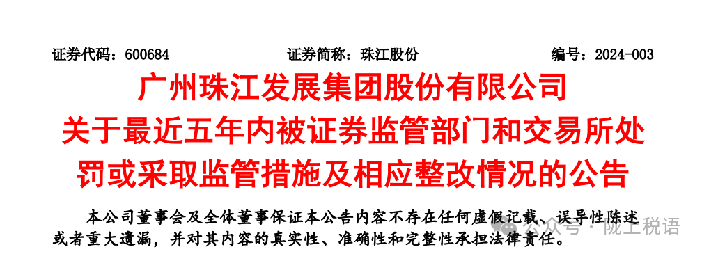 2020年11月16日,上海证券交易所出具《关于对广州珠江实业开发股份有限公司及时任董事会秘书兼财务总监覃宪姬予以监管关注的决定》(上证公监函 [2020]0122 号)。因公司2012年至2016年未按税法规定对销售珠江璟园项目取得的收入申报缴纳增值税、营业税、城市维护建设税及预征土地增值税,收到国家税务总局广州市税务局稽查局出具的《税务处理决定书》(穗税稽处〔2020〕12号)。根据上述《税务处理决定书》,公司应补缴税款合计184,412.94元,应补缴税款滞纳金合计35,144,031.84元。截至目前,公司已补缴税款及滞纳金,并收到完税证明。公司公告,补缴上述税款及滞纳金,分别计入应交税费和营业外支出科目,滞纳金部分拟计入2020年当期损益,预计减少2020年半年度净利润35,301,849.89元,占公司2019年经审计净利润的16.1%,达到临时公告的披露标准。该份《税务处理决定书》于2020年6月2日出具,但公司未及时履行信息披露义务,直至补缴税款并收到正式完税证明后,才于8月22日履行了信息披露义务,相关信息披露不及时。基于上述,上海证券交易所对公司及时任董事会秘书兼财务总监覃宪姬予以监管关注。