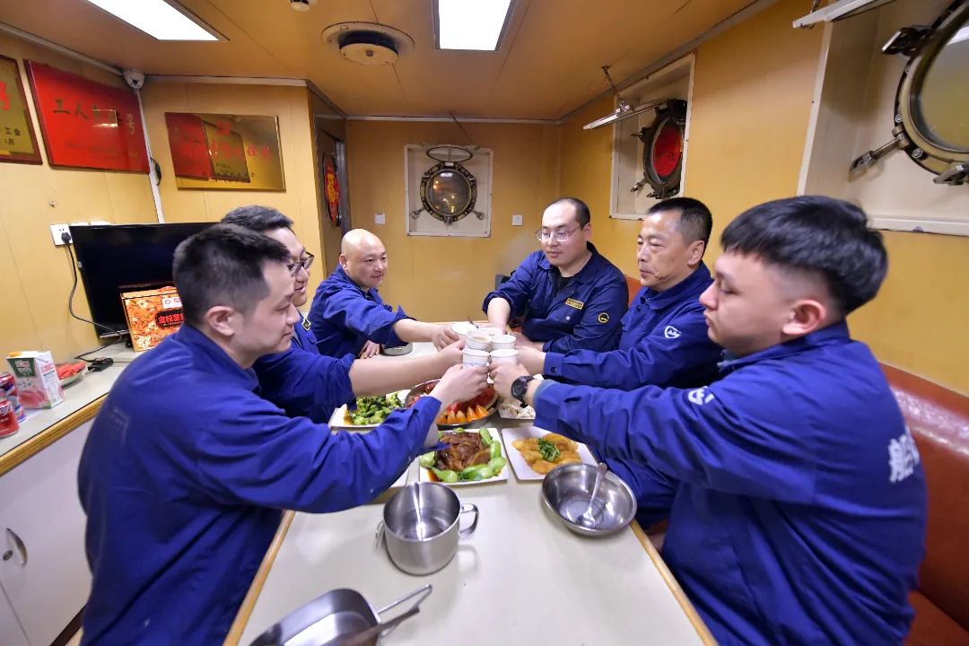 舷窗外寒风呼啸,气温降至零下十几摄氏度,拖轮厨房里却热气腾腾。利用工作间隙,大家轮番上阵当大厨。“宫保虾球,团团圆圆”“可乐鸡翅,展翅飞翔”“蒜蓉西兰花,春意浓浓”……人们为自己的拿手菜配上美好寓意,把对新一年工作生活的祝福端上餐桌。大家围坐在一起,边吃年夜饭边看春晚。