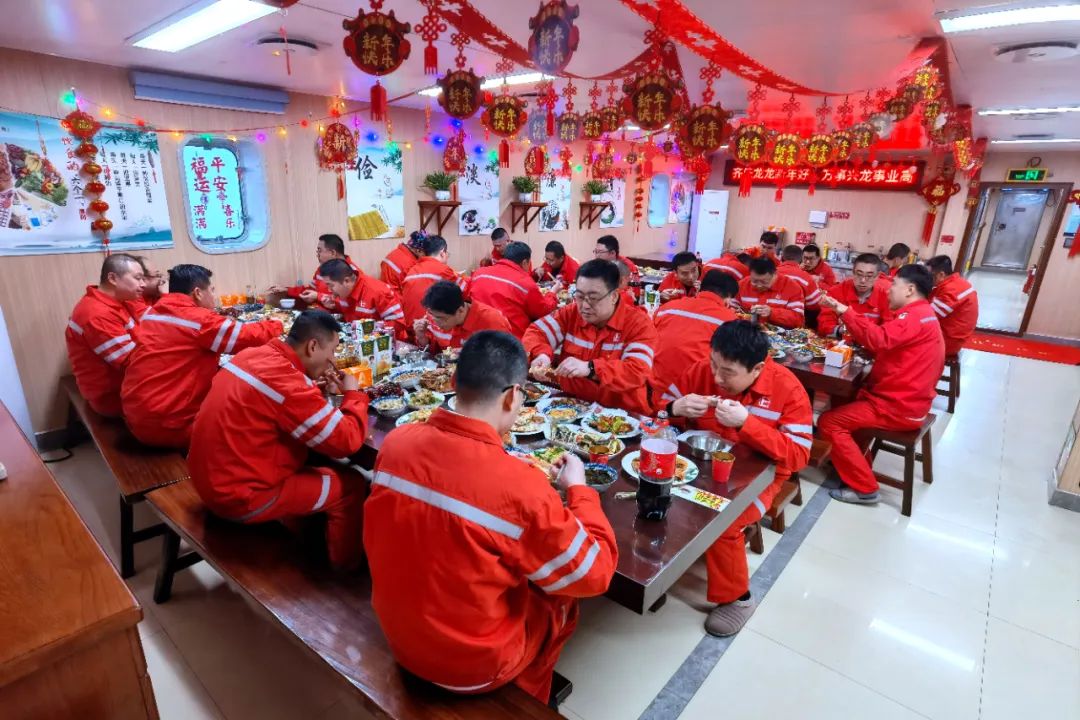 入夜,海上风平浪静,灯火闪耀的埕岛中心一号平台犹如一颗明珠,与远处星星点点的采油平台遥相辉映。年夜饭是重头戏,后厨准备了24道菜,犒劳这些过年期间仍奋战在一线的石油工人。大家以茶代酒,轮流起身送上祝福,餐厅内欢声笑语不断。
