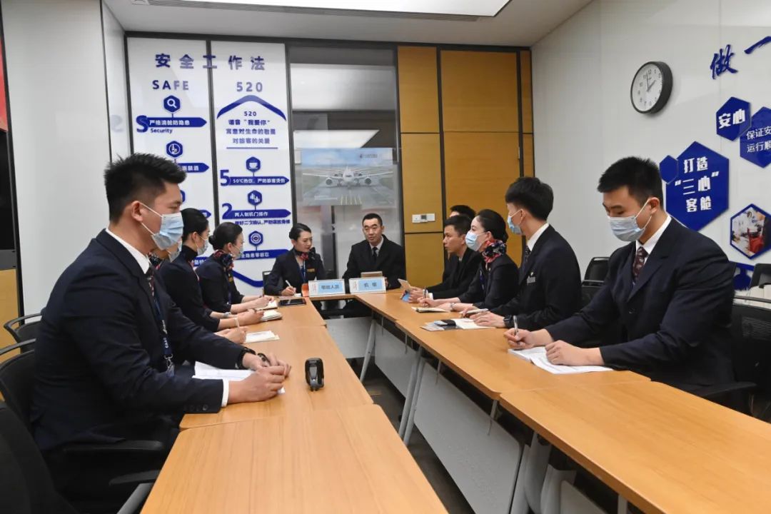 另一间准备室里,乘务长方璇和乘务员们做着精心准备。因为有新人加入,舱门如何关闭、特殊情况如何处理、怎样向旅客介绍国产大飞机等内容,她都带着大家温习了一遍。